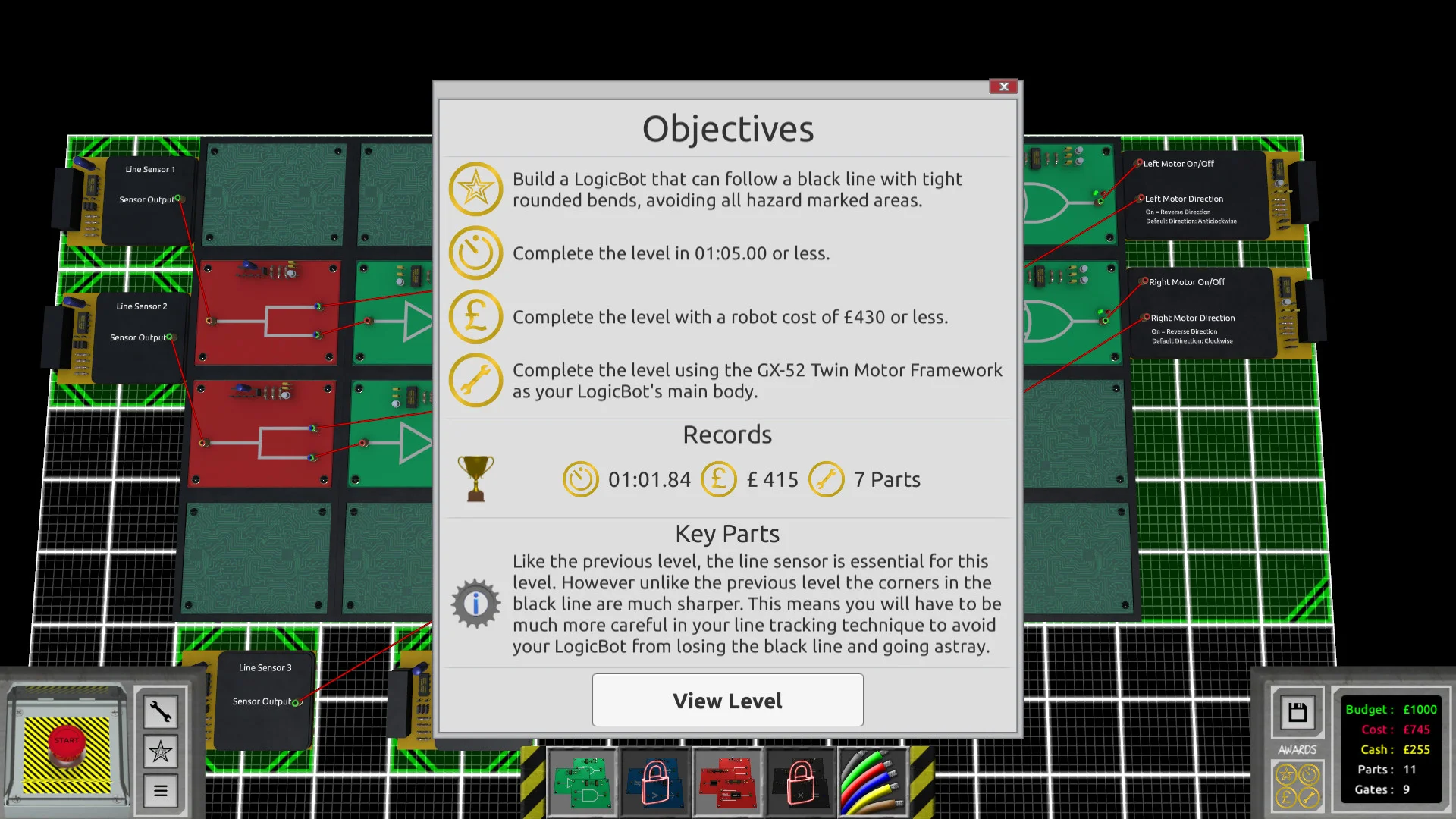LogicBots - это логическая головоломка, в которой вам предстоит проектировать, собирать и прокладывать электрические цепи для собственных роботов. Каждая из 40 уровней предлагает уникальные задачи: иногда вы сами управляете своим LogicBot, а порой он действует автономно в соответствии с созданной вами схемой. Чтобы пройти уровень, нужно продумать структуру робота, подобрать детали и соединить их проводами так, чтобы он выполнял заданные действия.