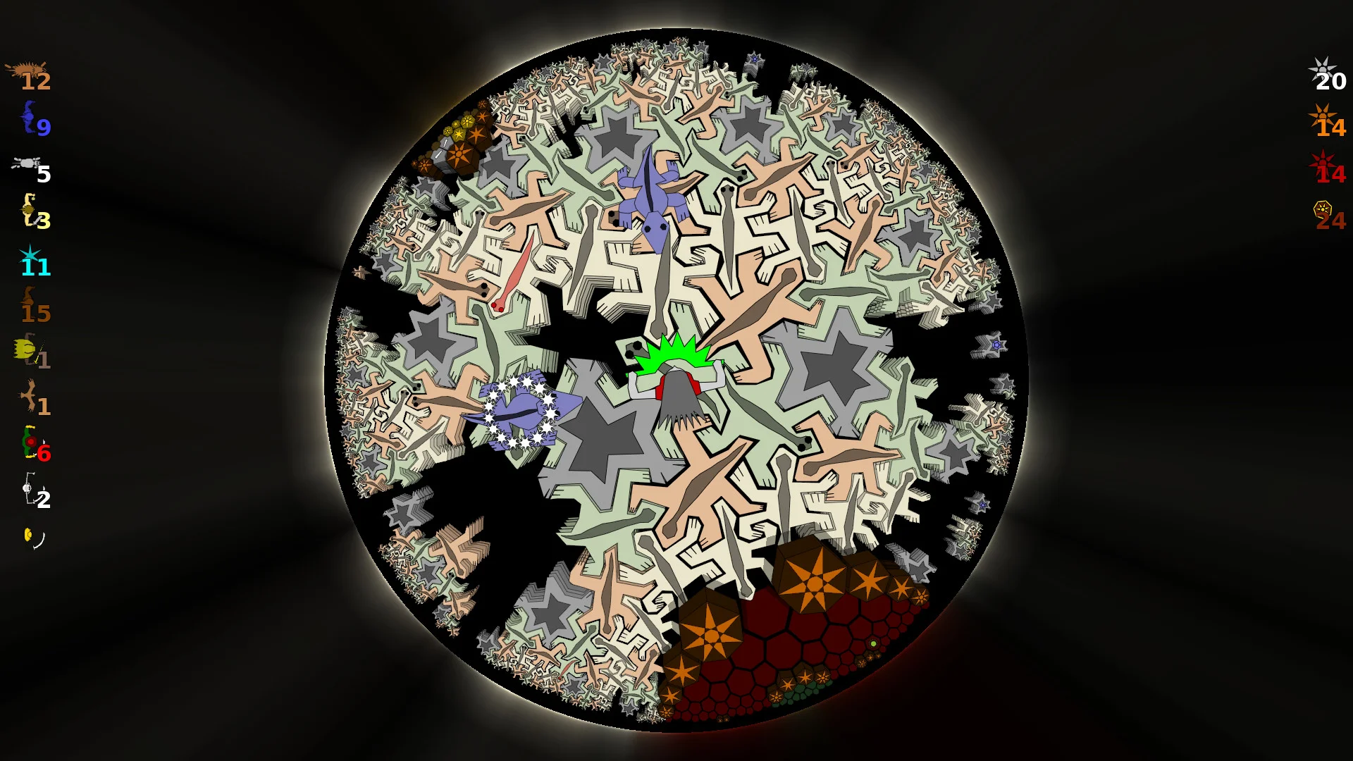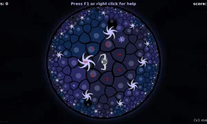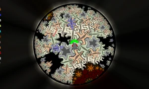 - Игра происходит на гиперболической плоскости с комбинацией шести- и семиугольников, где "параллельные" прямые расходятся, а треугольники имеют сумму углов меньше 180°.