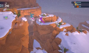 Во первых - камера. Камера это давний повод массовых (по меркам скромной инди-игры конечно) срачей, если вы зайдёте на форум любой из двух частей, наверняка среди самых последних тем кто-нибудь будет жаловаться на камеру. Эти люди одновременно и правы и не правы, не правы потому что это артстиль и он имеет право на существование, правы потому что очень часто можно убиться только из-за неудобного ракурса, или когда тебе что-нибудь закрывает обзор. В Snow Riders даже появилась новая фишка, когда камера показывает спуск сбоку, как в сайд-скроллере, ты катишься, а перед тобой вылезают камни, деревья и всё такое прочее. Прямо "турбо туннель 2к25" в миниатюре.